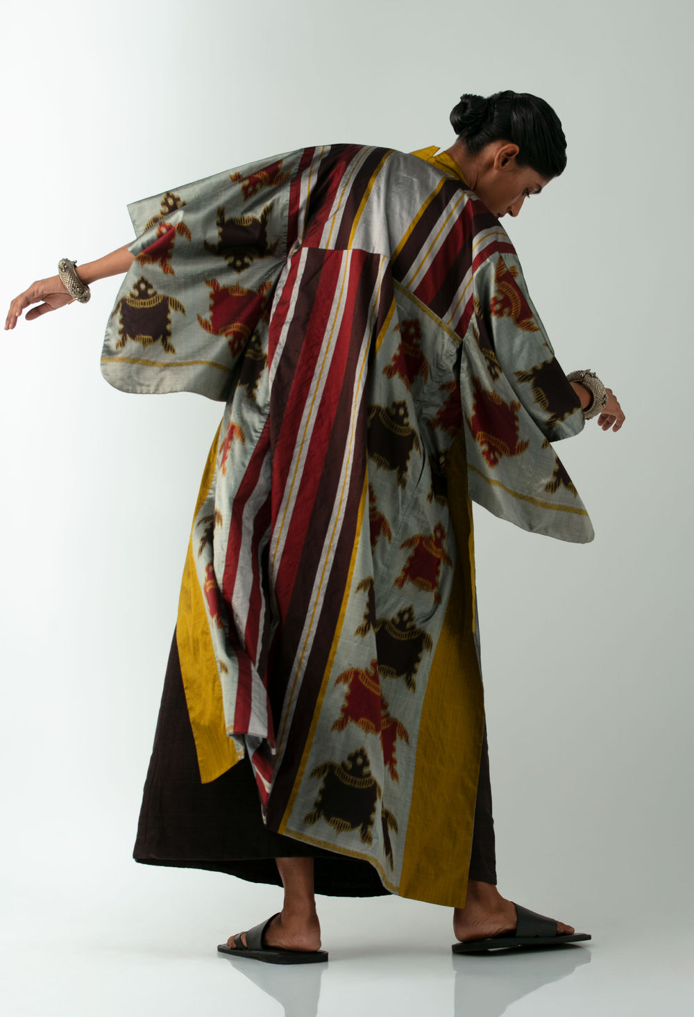 An elegant and timeless outer layer, full-length in single-ikat silk - featuring the majestic sea turtle. A fluid silhouette, encouraging the wearer to slow down, live long and travel far.