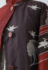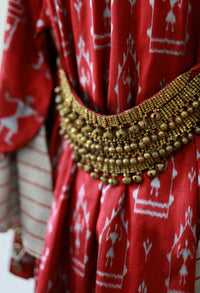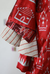 The Tarini Coat reflects the fierceness of the sisters. Tailored in crimson Sambalpuri bandha silk, the white motifs show the goddess housed in her mountain abode - ready to defend her territory and her followers. A dhokra metal belt, cast using the ancient lost-wax technique, adds sculptural strength - echoing ritual armour worn by the divine.
