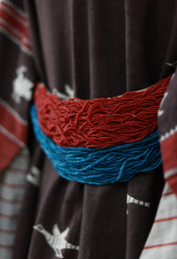 The Tara Coat is a long ensemble in handwoven Kotpad cotton - aal-dyed the colours of fertile river beds. The eyes of the goddesses cast a protective gaze upon the extra-weft birds, peacocks, temples and trees. The belt is strung with colourful lubu beads - worn by women of the Bonda community.